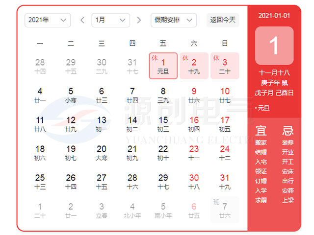 2021年1月1日至3日放假,共3天。