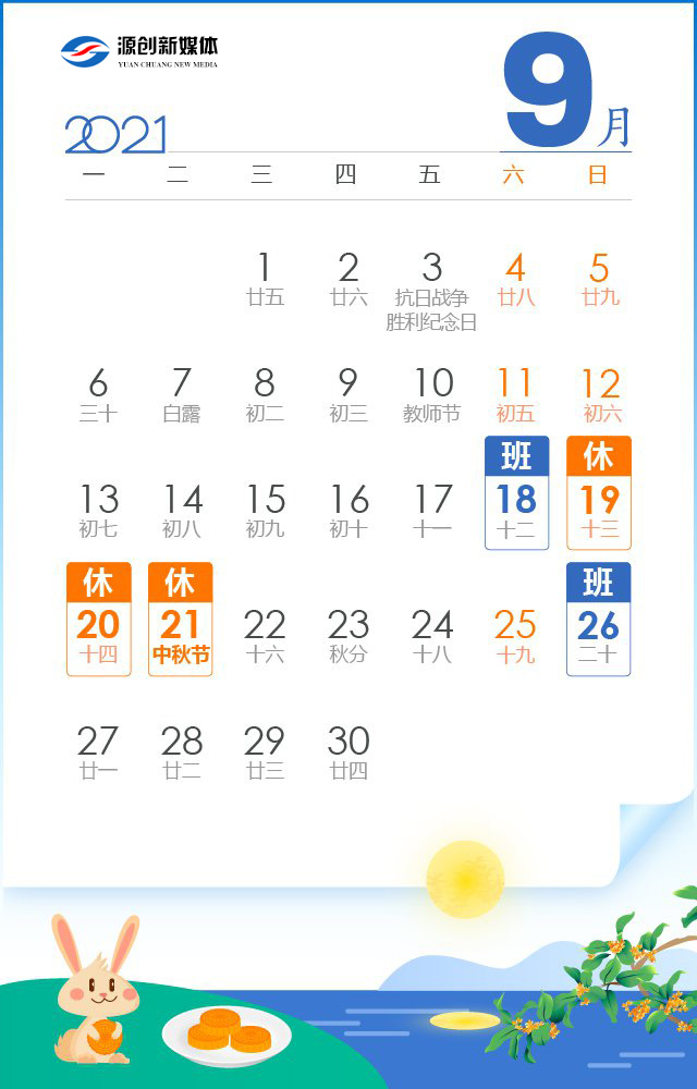 9月19日至21日放假調休,共3天。9月18日(星期六)上班