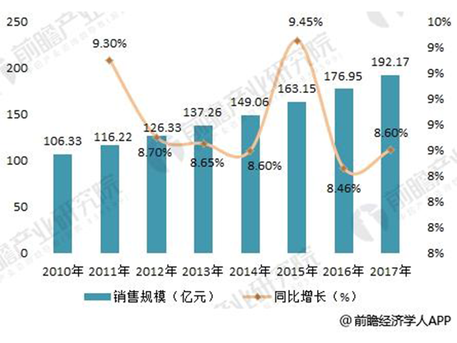 前瞻產(chǎn)業(yè)研究院發(fā)布的《2018-2023年中國(guó)低壓配電柜行業(yè)發(fā)展前景與投資預(yù)測(cè)分析報(bào)告》數(shù)據(jù)顯示,2010-2017年,我國(guó)低壓配電柜行業(yè)銷售額增長(zhǎng)基本維持在8.4%以上。近兩年,由于宏觀經(jīng)濟(jì)進(jìn)入新常態(tài)、電力投資增速不斷放緩等影響,低壓配電柜行業(yè)銷售規(guī)模增長(zhǎng)較為穩(wěn)定。2017年,低壓配電柜市場(chǎng)銷售規(guī)模約為192.17億元,同比增長(zhǎng)8.60%,僅較2016年提高了0.14個(gè)百分點(diǎn)。