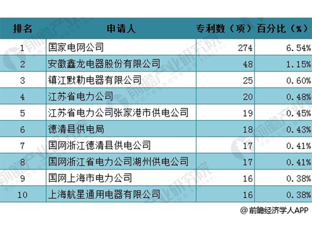 在專利技術(shù)申請(qǐng)人排名前十中,國(guó)家電網(wǎng)公司一家獨(dú)大,截至2018年5月底,申請(qǐng)專利達(dá)到274項(xiàng),占全國(guó)申請(qǐng)專利的6.54%;排在第二的安徽鑫龍電器股份有限公司專利申請(qǐng)量只有48項(xiàng),占比為1.15%;其他公司申請(qǐng)專利量不到30項(xiàng)。