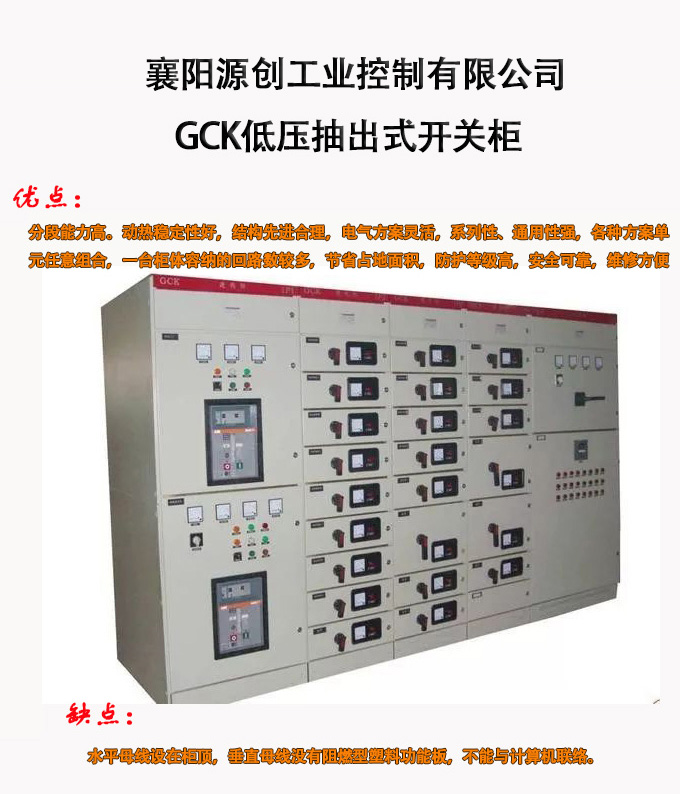 GGD是固定柜、GCK、GCS、MNS是抽屜柜,GCK和GCS、MNS柜抽屜推進機構不同,GCS柜只能做單面操作柜,深800mm,MNS柜可以做雙面操作柜,深1000mm,總的來說抽出式柜較省地方,維護方便,出線回路多,造價貴;固定式相對出線回路少,占地較多,如果客戶提供地點太少,做不了固定式的要改為抽屜式。