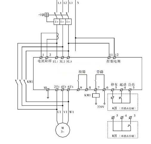 電機(jī)軟啟動(dòng)器電機(jī)軟啟動(dòng)器與旁路接觸器控制回路接線圖