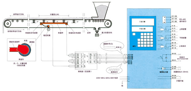 上述兩個(gè)被測量的物理量(重量和速度)被同時(shí)傳到稱重積算儀中, 電子皮帶秤重量和速度兩個(gè)物理量在稱重積算儀中被立即(約0.0001秒)計(jì)算成為法定重量單位(公斤 -kg,噸 -t,磅 -lb),并按用戶的設(shè)定顯示出瞬時(shí)流量和累計(jì)量。同時(shí)送出各遠(yuǎn)傳信號(hào)。